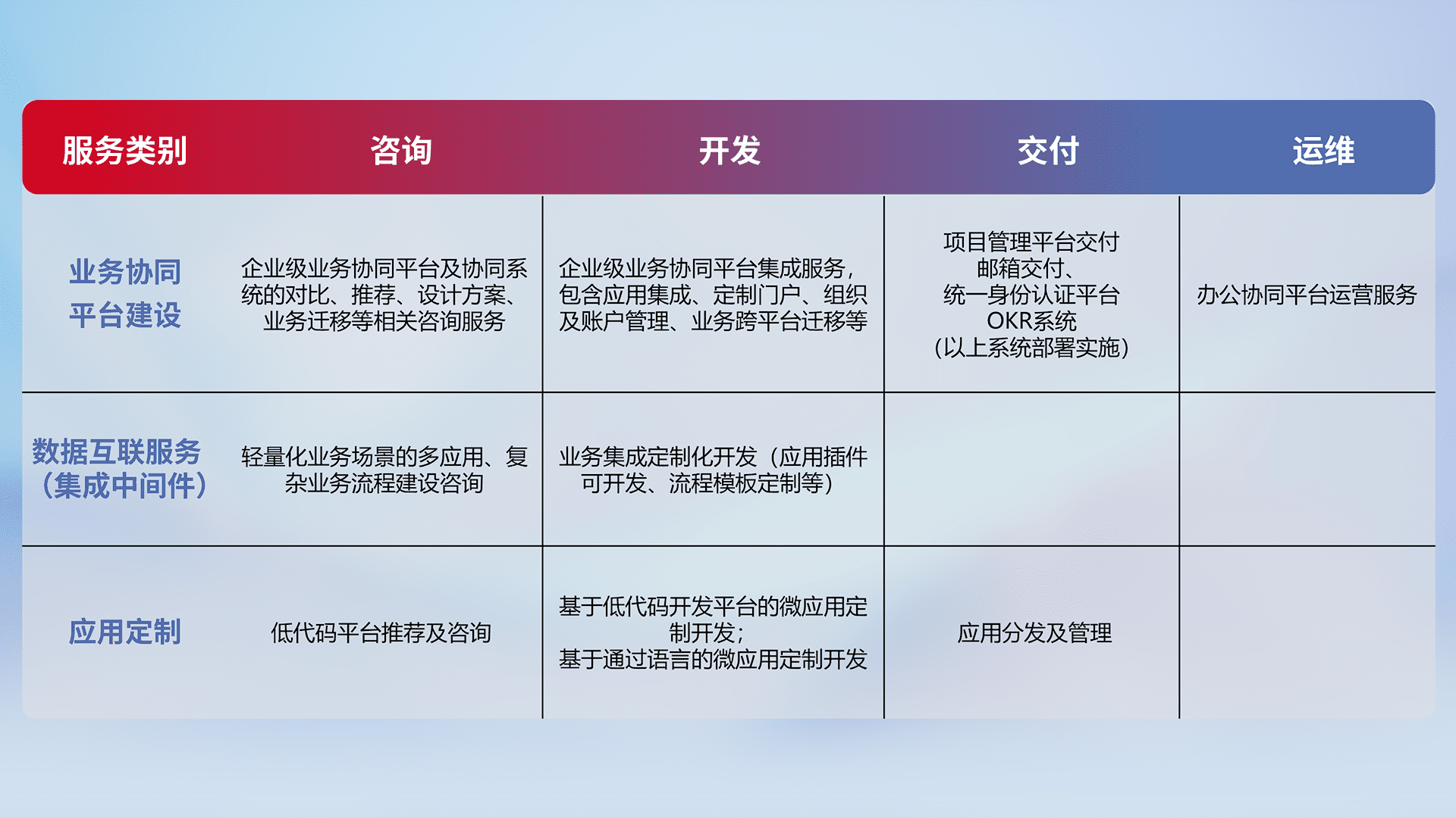 针对钉钉、、、、企微、、、IDaas等平台级产品提供产品的规划、、、方案、、、交付、、、定制化开发等服务,,,实现如统一协同办公、、智能客户服务、、、混合会议管理、、、、智能数据查询、、、等业务场景,,,,实现数字化转型。。。